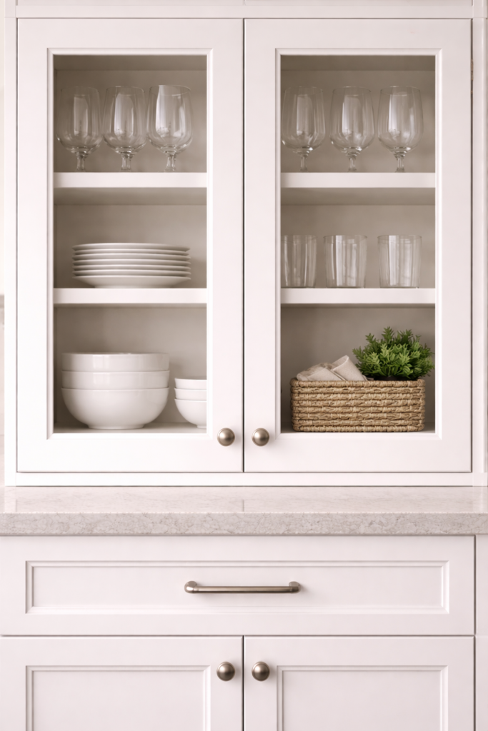 Glass front cabinet doors feature a glass center panel, which can be clear, frosted, or textured. They’re commonly used to showcase dishware or add visual interest.