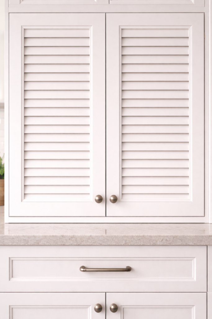 Louvered doors feature horizontal slats that allow airflow. While less common in modern kitchens, they’re often used in beach or tropical designs.